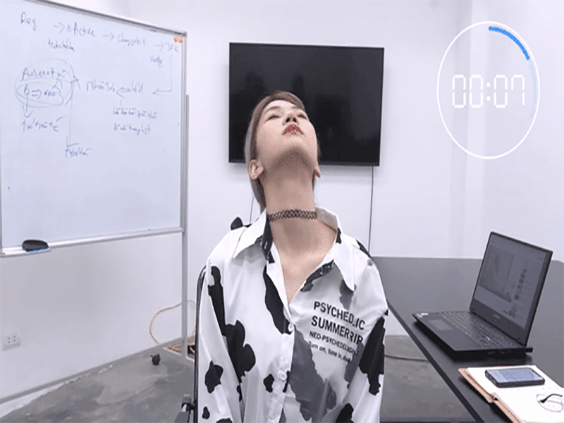 – Đặt hai tay ra sau gáy, mông ngồi sát thành ghế, đầu gối vuông góc.