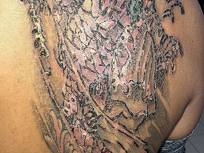 BS Vũ Thị Phương Dung, khoa Điều trị bệnh da nam giới, BV Da liễu TƯ cho biết, nam bệnh nhân 29 tuổi quê ở Ninh Bình đã xăm hình xăm lớn trên lưng và vai phải nhiều năm.